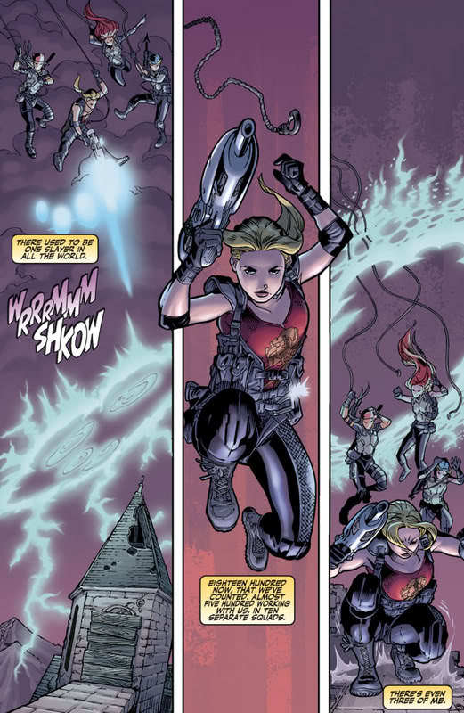 Cette saison 8 démarre donc sur une Buffy chef de commando. Comme je lisais déjà les comics à l’époque de la série, je n’ai pas été surprise du graphisme un peu particulier des personnages. Dans l’ensemble, il est assez ressemblant, on reconnait bien les protagonistes, même si à certaines cases, ça laisse plutôt à désirer. Mais ça, on aime ou on aime pas, le style comics c’est assez spécial quand même. Ca donne tout de même un nouveau souffle très appréciable à la série.