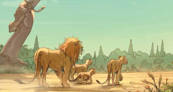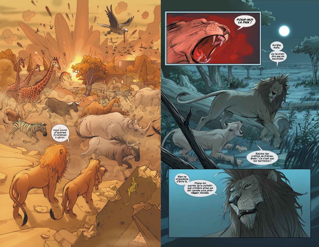 C’est donc une grande claque que l’on prend à la lecture de ce livre où diverses émotions s’emparent de nous au fur et à mesure de notre avancée dans l’œuvre et de l’évolution des personnages. Quel destin que celui de ces lions lâchés dans une nature plus cruelle encore que celle qu’ils ont jadis connus pour certains. Cette ambiance si violente et pourtant pleine d’espoir nous envoûtent dès les premières cases grâce à un travail très soigné de colorisation (il n’y a d’ailleurs qu’à voir la couverture de folie pour s’en rendre compte).