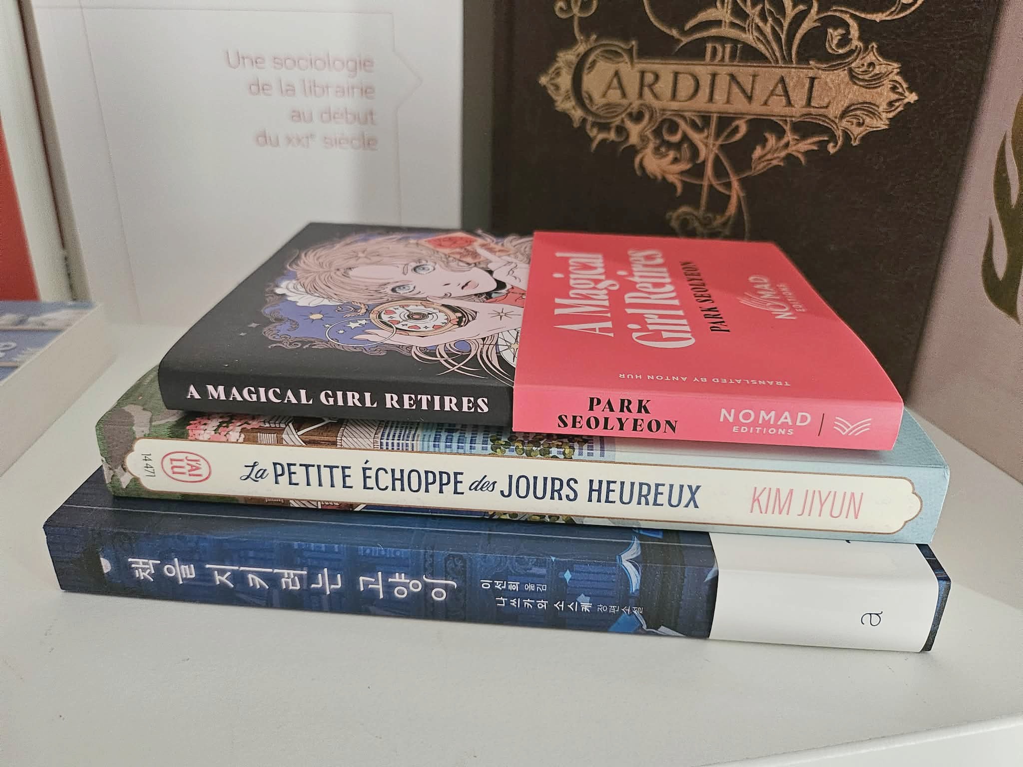 Ces aspects m’ont encore plus frappé lors de mon voyage en Corée l’année dernière. J’ai passé beaucoup de temps en librairie et là-bas, les livres sont rarement plus grands qu’un semi-poche. La fabrication est soignée : le papier est doux, épais, le livre s’ouvre facilement sans casser son dos, le poids est juste comme il faut et le rendu au toucher de la couverture est très plaisant. Rajoutez en plus des couvertures super jolies et on craque facilement.