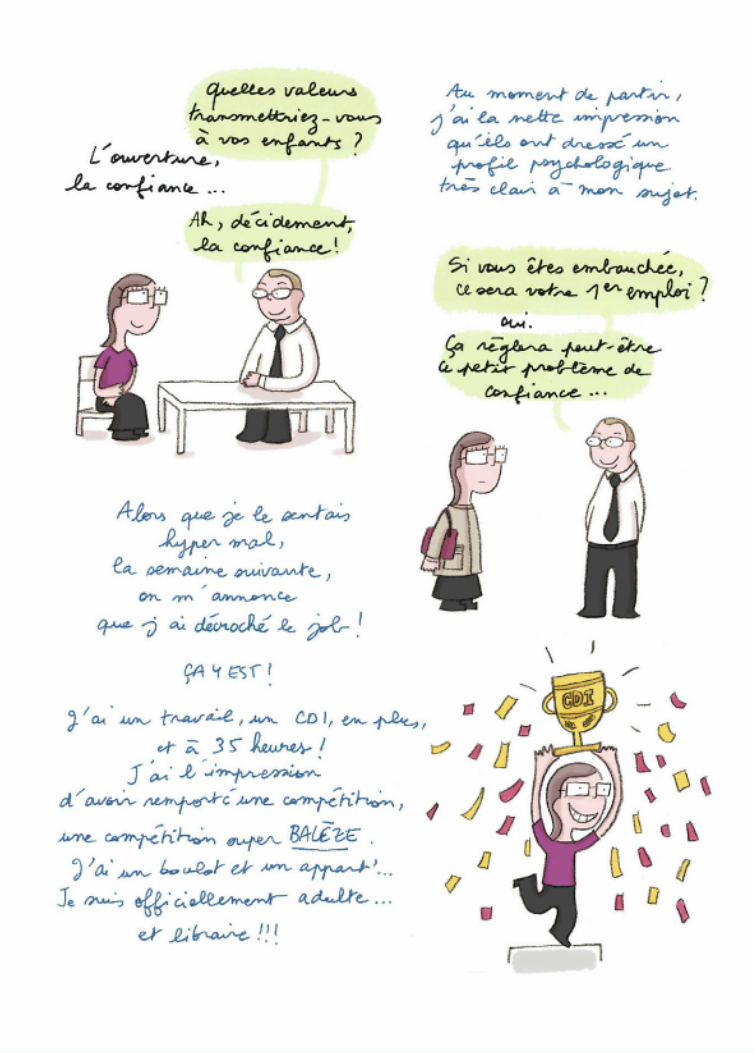 Je conseille toujours à mes collègues l’excellent livre de Leslie Plée : Moi vivant vous n’aurez jamais de pauses ou comment j’ai cru devenir libraire (Delcourt – 17€95). Une BD qui raconte son expérience dans une grande surface culturelle (ici Cultura) et qui donne une très juste vision du travail dans ce que l’on appelle les GSS (Grandes surfaces spécialisés). Pour y avoir travaillée pendant plusieurs années, je confirme m’y être retrouvée à plus d’un titre.