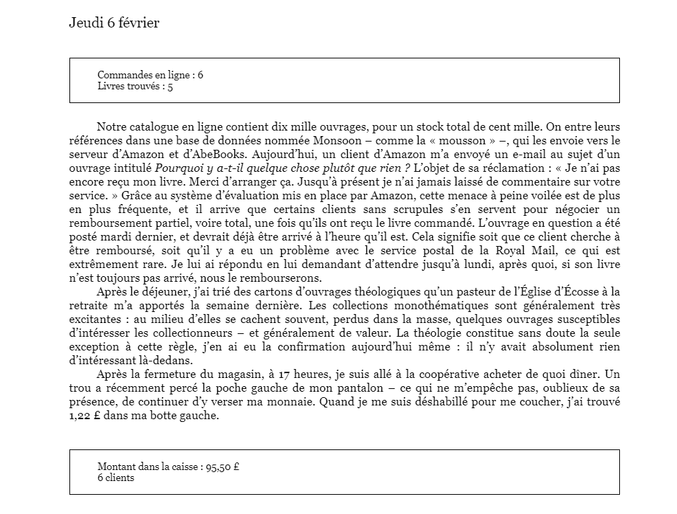 J’aime bien lire les expériences d’autres libraires parce que même si nous faisons le même métier, nous ne le faisons pas tous de la même manière et cela est fascinant de découvrir le quotidien de mes confrères. J’ai découvert récemment Shaun Bythell qui partage son quotidien sous forme d’un journal où il note tout ce qui se passe dans sa librairie. Le livre s’appelle Le libraire de Wigtown (Autrement – 21€) et est le premier d’une série en cours dont j’attends impatiemment les prochains tomes.