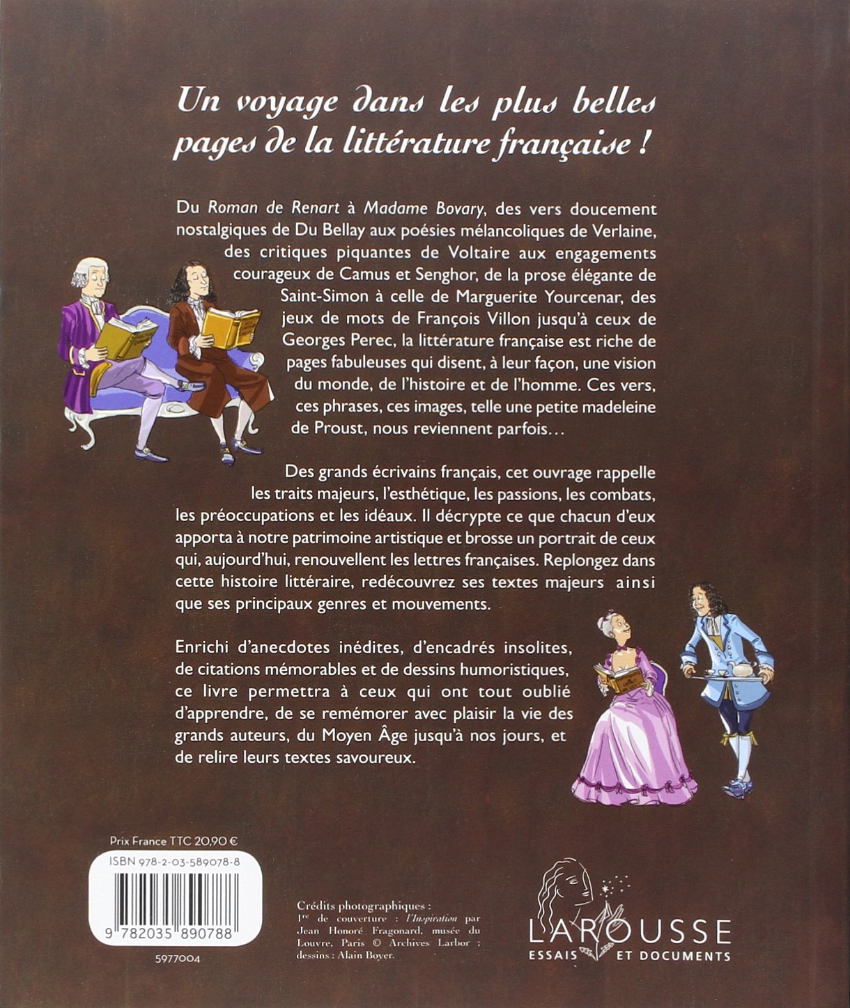 Style similaire chez Larousse cette fois avec le livre La Littérature pour ceux qui ont tout oublié. Tout aussi complet peut-être même un peu plus que le Bescherelle, on regrettera juste le côté page effet photocopie là où on s’attend à des pages couleurs et où la couverture marron et bronze donne l’impression d’un beau livre.